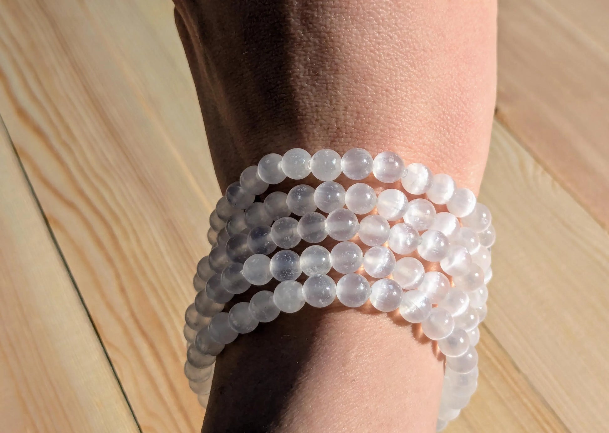 These beautiful selenite bracelets are rare for us to have. They are AAA grade and absolutely gorgeous in the sunlight. Selenite is a high frequency stone that is great for creating peace. Highly associated with the moon, it has a strong feminine energy and is very soothing. It has powerful healing qualities for the Third Eye and Crown Chakras, and can help with recovering from trauma. Selenite can help shift through energetic blocks, and open your connection with the Divine and the Universe.