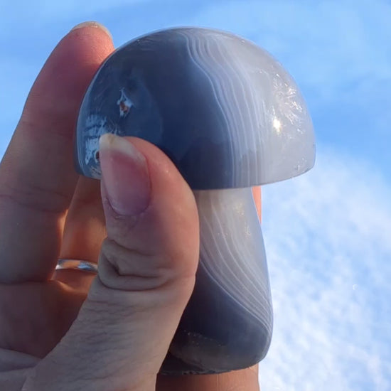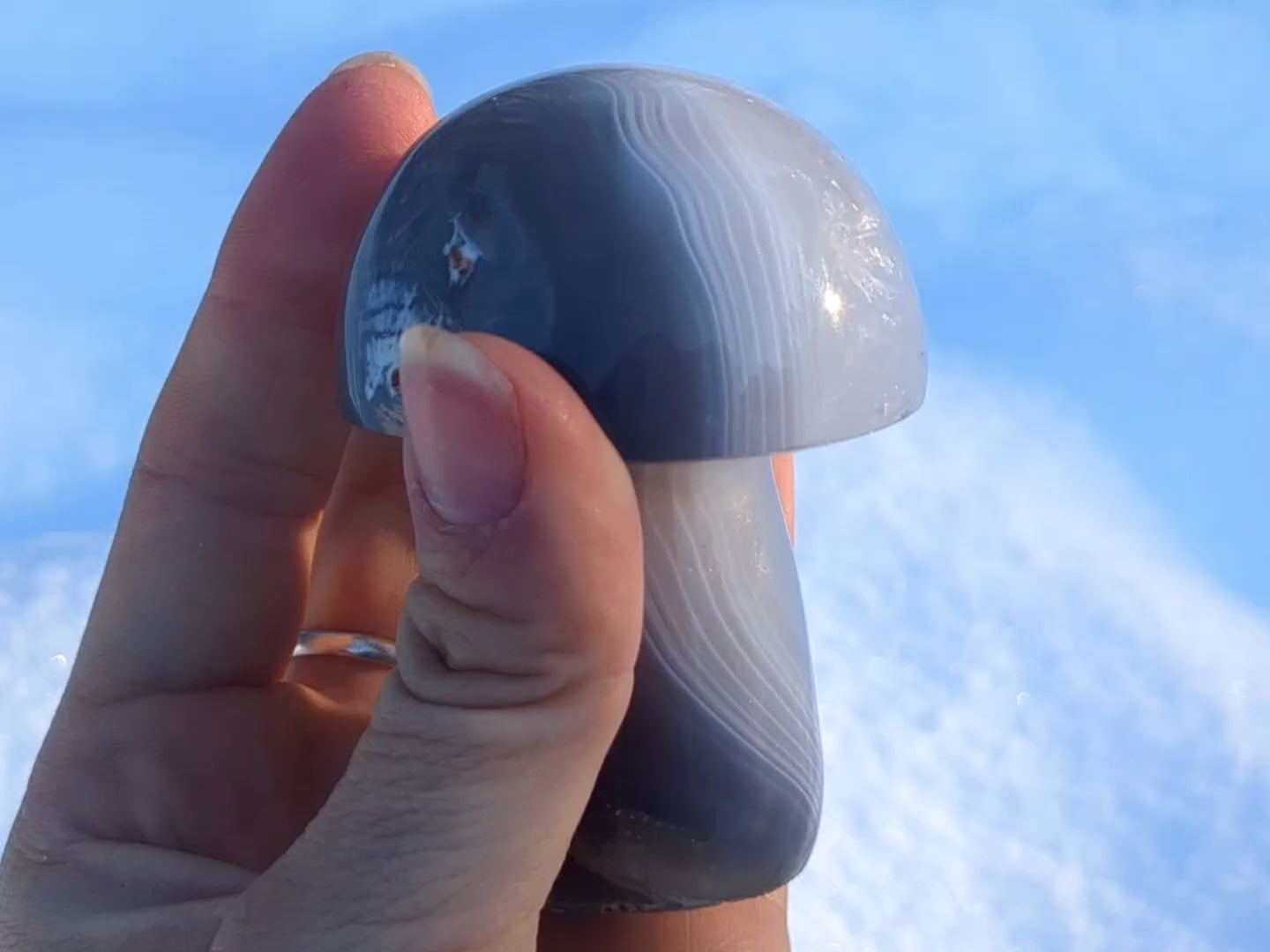 Banded Agate is a variety of chalcedony that forms due to a process called deposition. Over many years layers of sediment will settle in groundwater reserves and cavities, slowly crystallizing and creating bands of color due to various impurities in the microscopic quartz structure. This leaves us with a huge variety of color, patterns, and varieties of agate that are simply stunning to look at and a thrill to collect. It is not uncommon for quartz to form in geode pockets with agate, such as in this mushroom carving. It is absolutely gorgeous!