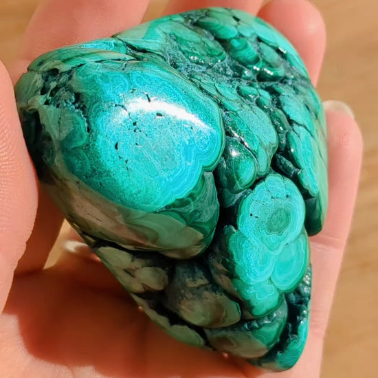 Geologically, malachite is a gorgeous green copper carbonate hydroxide mineral. It forms at shallow depths within the Earth, precipitating from descending solutions in fractures and cavities of porous rock near copper deposits. It's striking bands of dark and light green are similar to agate in its mesmerizing patterns, eyes, and swirls.