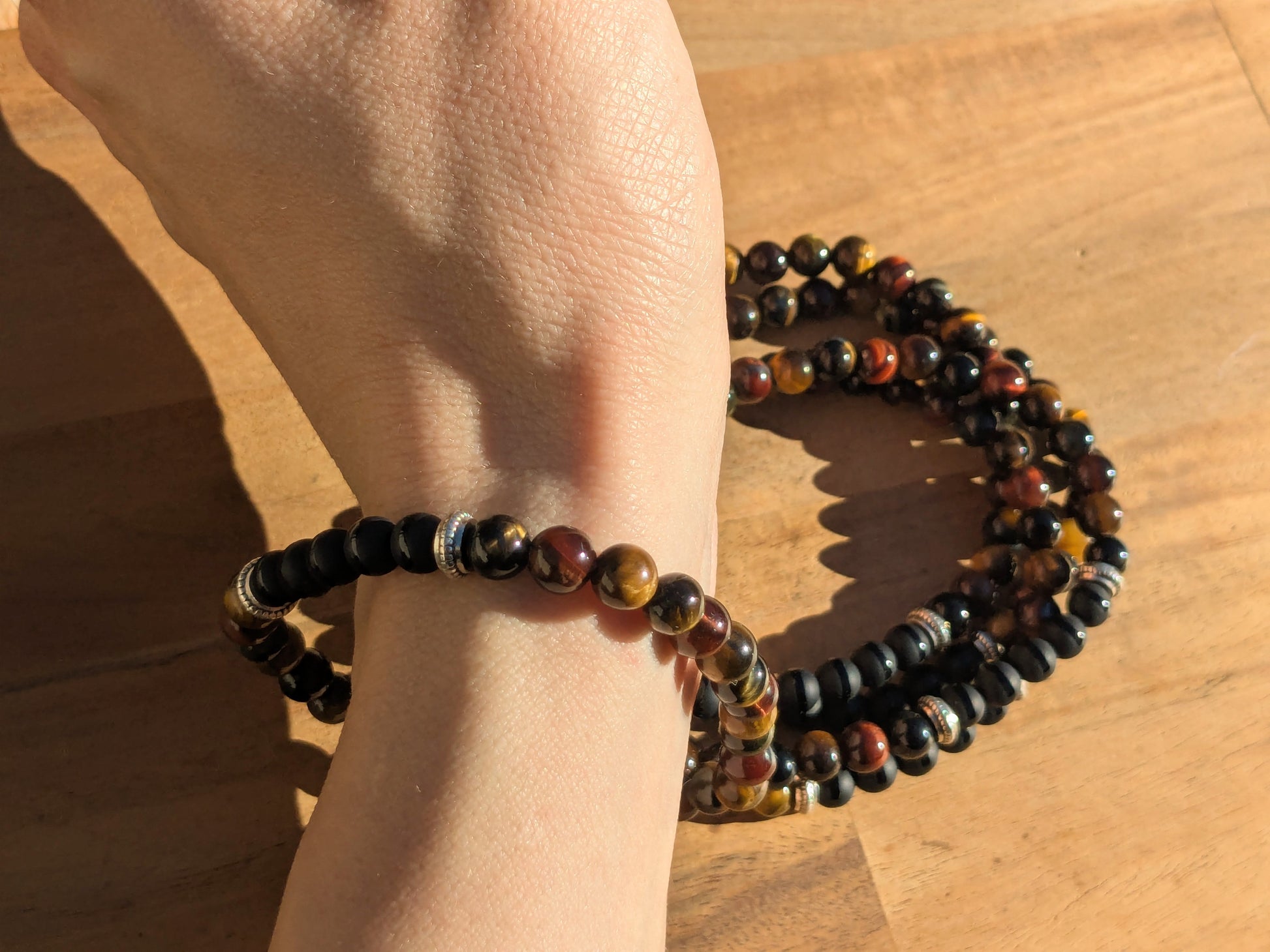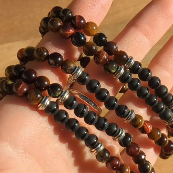 These gorgeous bracelets have high quality golden, blue, and red tiger's eye that showcase incredible chatoyancy in the light. There is a small accent of black agate beads that are matte and have a polished stripe down their center.
