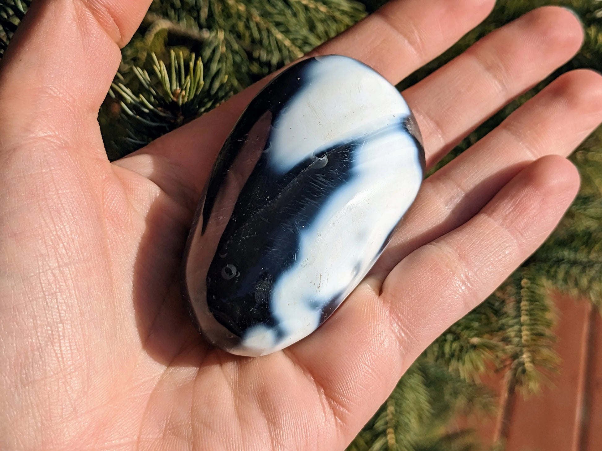 Orca Agate is a stone of communication and truth. It is a great stone to work with when you are working on communication skills, whether that be learning to speak your truth, public speaking, or not backing down from confrontation. It helps creates inner peace. This stone is also associated with the ocean, hence its name referring to the orca whale. The black and white duality of this stone is also great for Geminis.