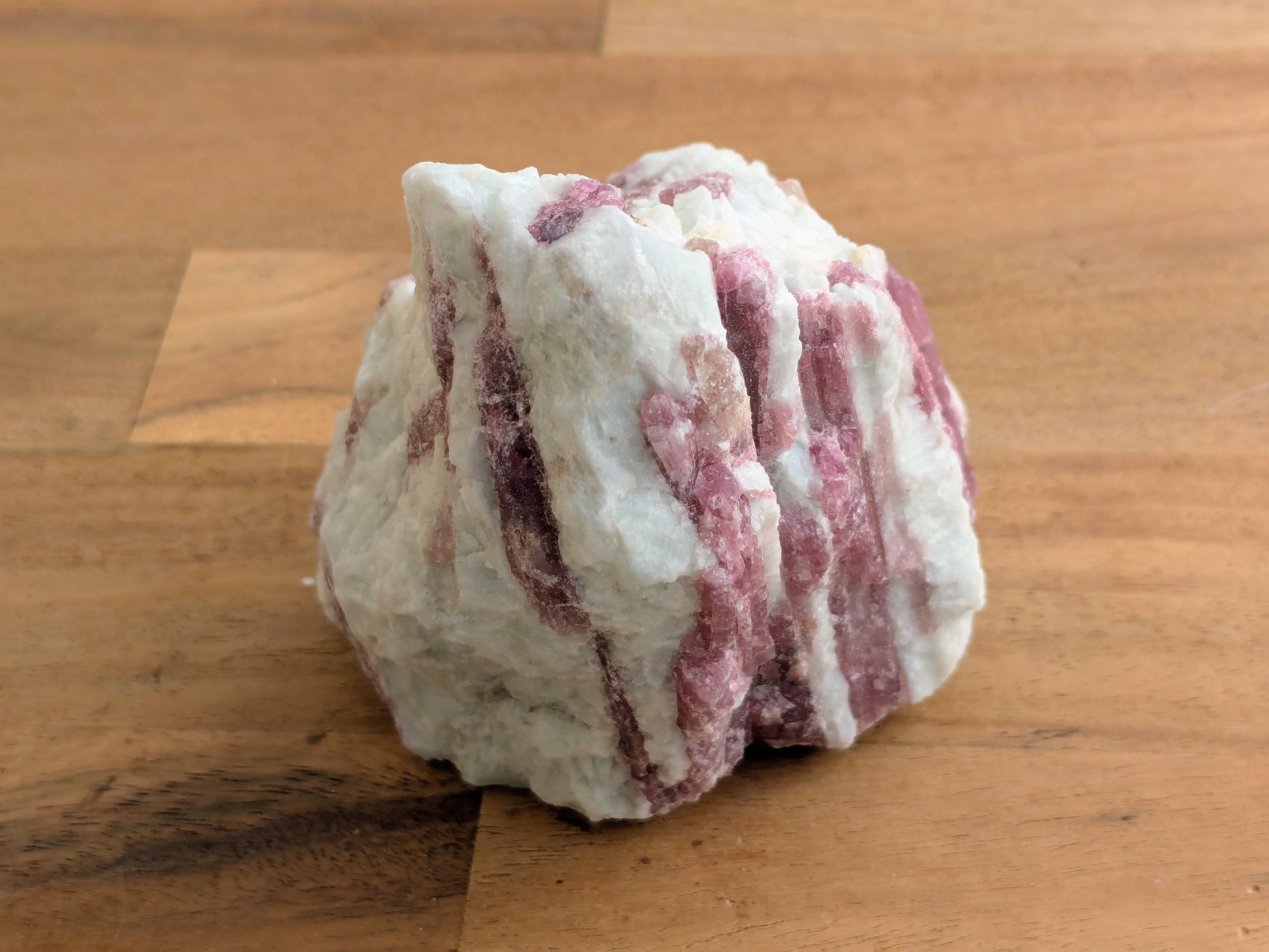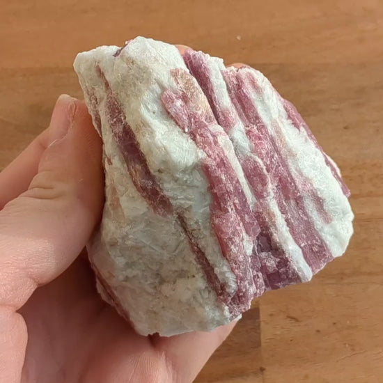 Geologically, pink tourmaline is a gorgeous crystal that features a rosy pink coloration. It forms when liquid magma from volcanic explosions cools down into igneous rocks. Borosilica acid will shift from a gas or liquid into a solid state during the cool down phase, creating tourmaline between the igneous rocks. The different types of trace minerals in the acid will attribute to tourmaline's rainbow of colors. This particular specimen is formed in pegmatite, a type of igneous stone that is high in quartz and feldspar and has conspicuous, interlocking crystal structures.