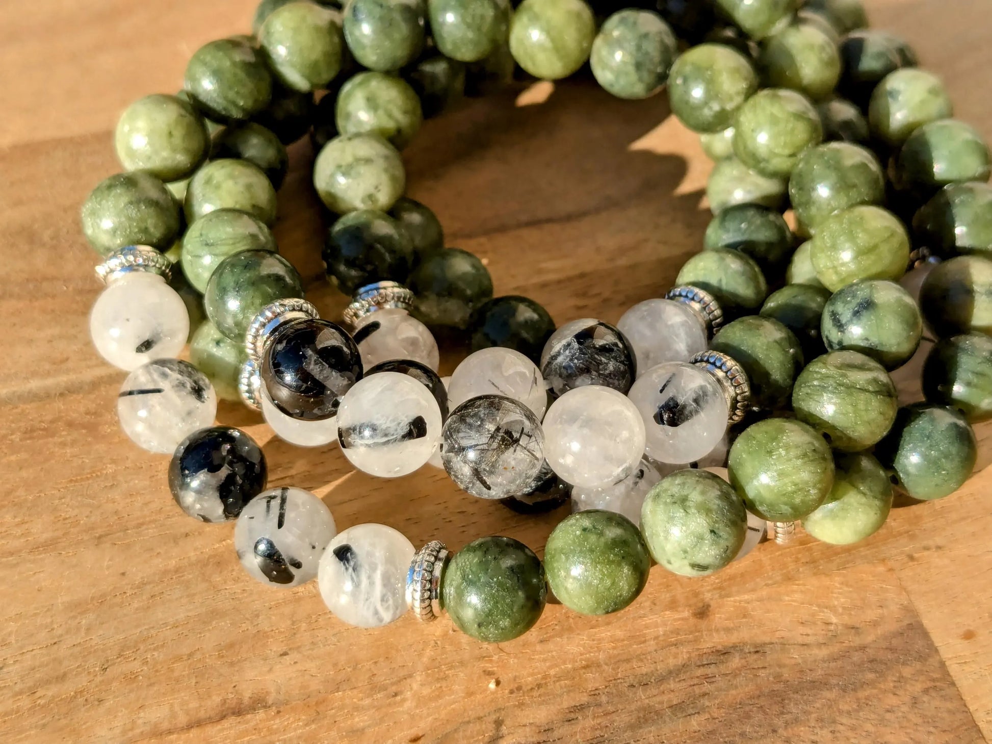 A unique but incredibly powerful pairing, serpentine and tourmilated quartz bring forth protection and flow to its wearer. Serpentine breaks up stagnant energy, weaving its way into neglected corners of the mind and body and ushering in healing and life energy. It is strongly associated with serpent energy, hence it's name, and can offer serpent wisdom. Tourmilated quartz is an amplified version of black tourmaline. Incredibly protective and energizing, these two stones with serpentine will offer harmony and confidence.