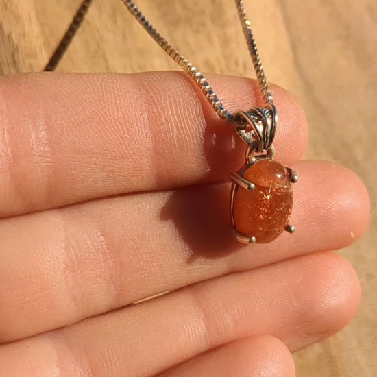 This gorgeous sunstone pendant is entirely covered in shimmer. It is fully set in sterling silver and has a beautiful sterling leaf bail detail. It comes with a 20" sterling silver box chain.